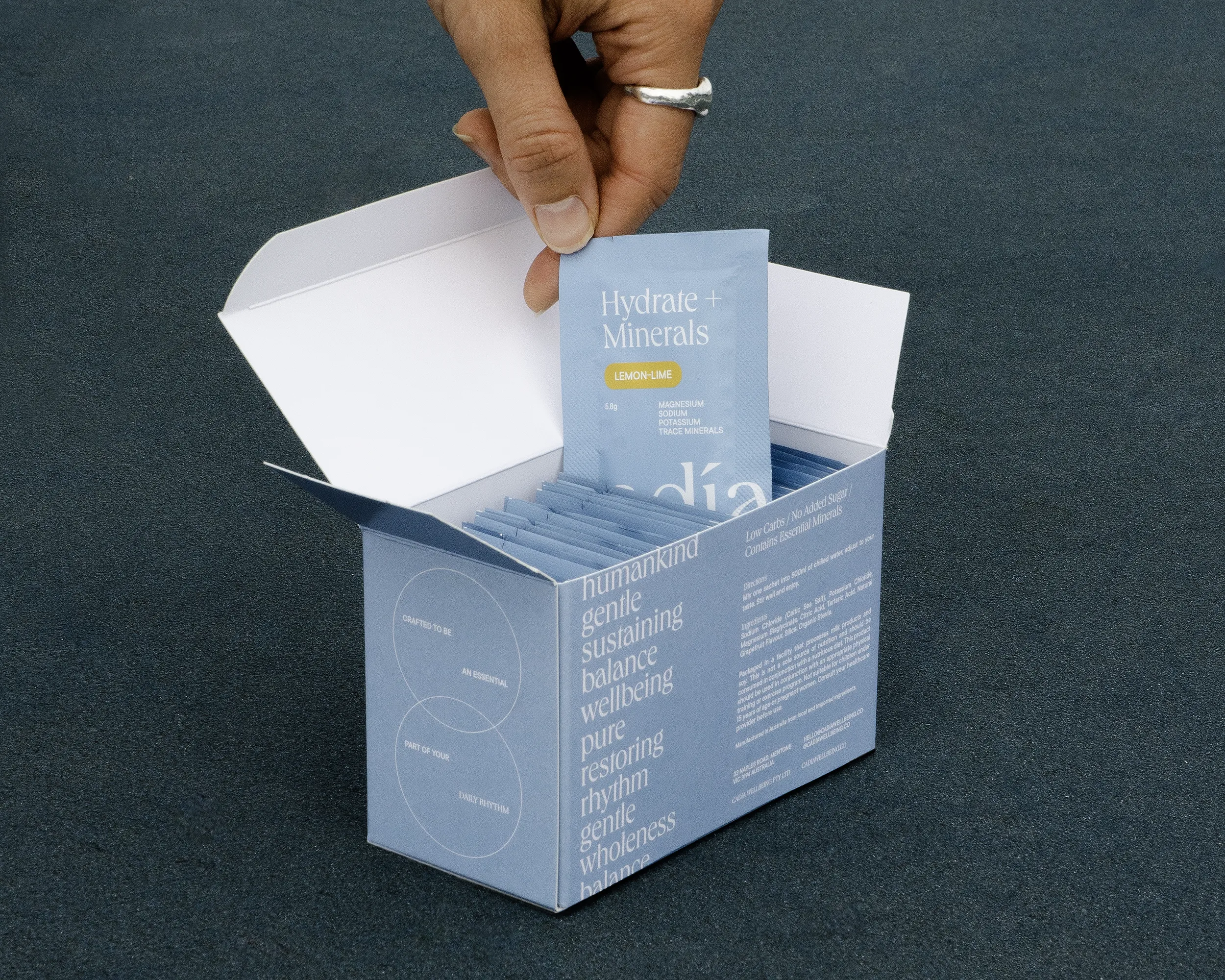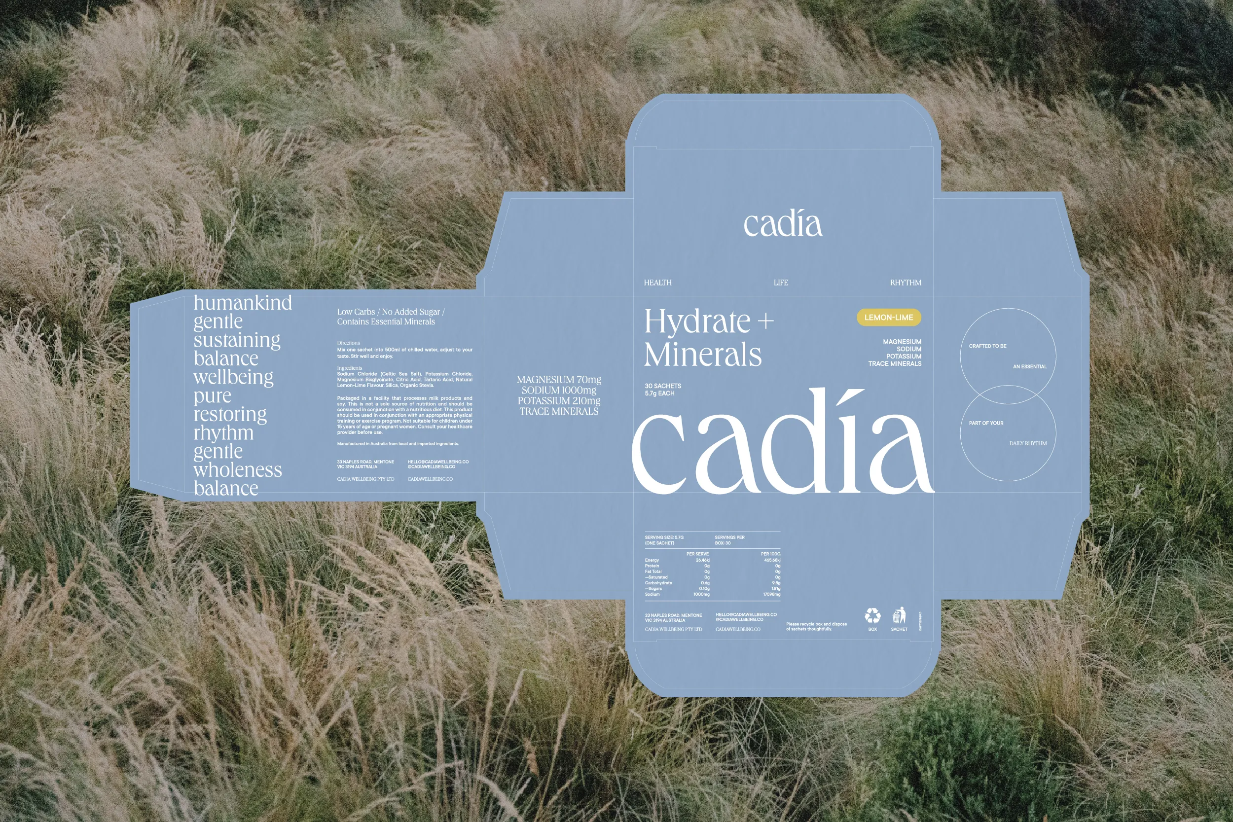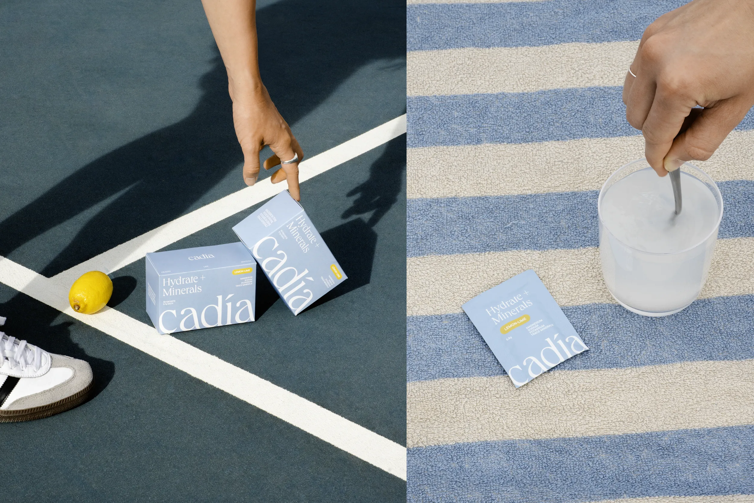 Cadía Wellbeing's electrolyte sachets are an essential part of a healthy, hydrated daily rhythm. We crafted a brand for Cadía that stands out in the electrolyte market and resonates their customers.