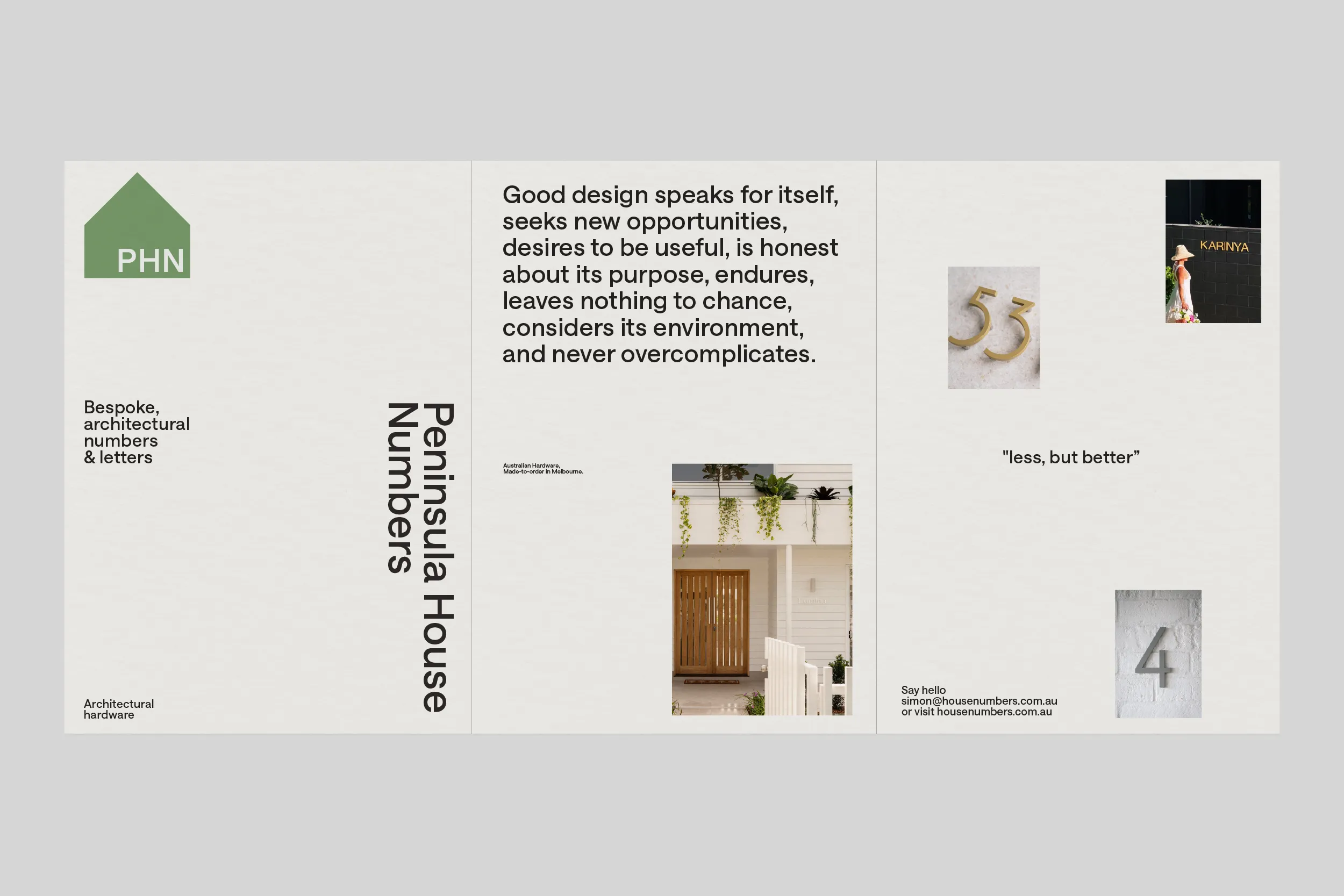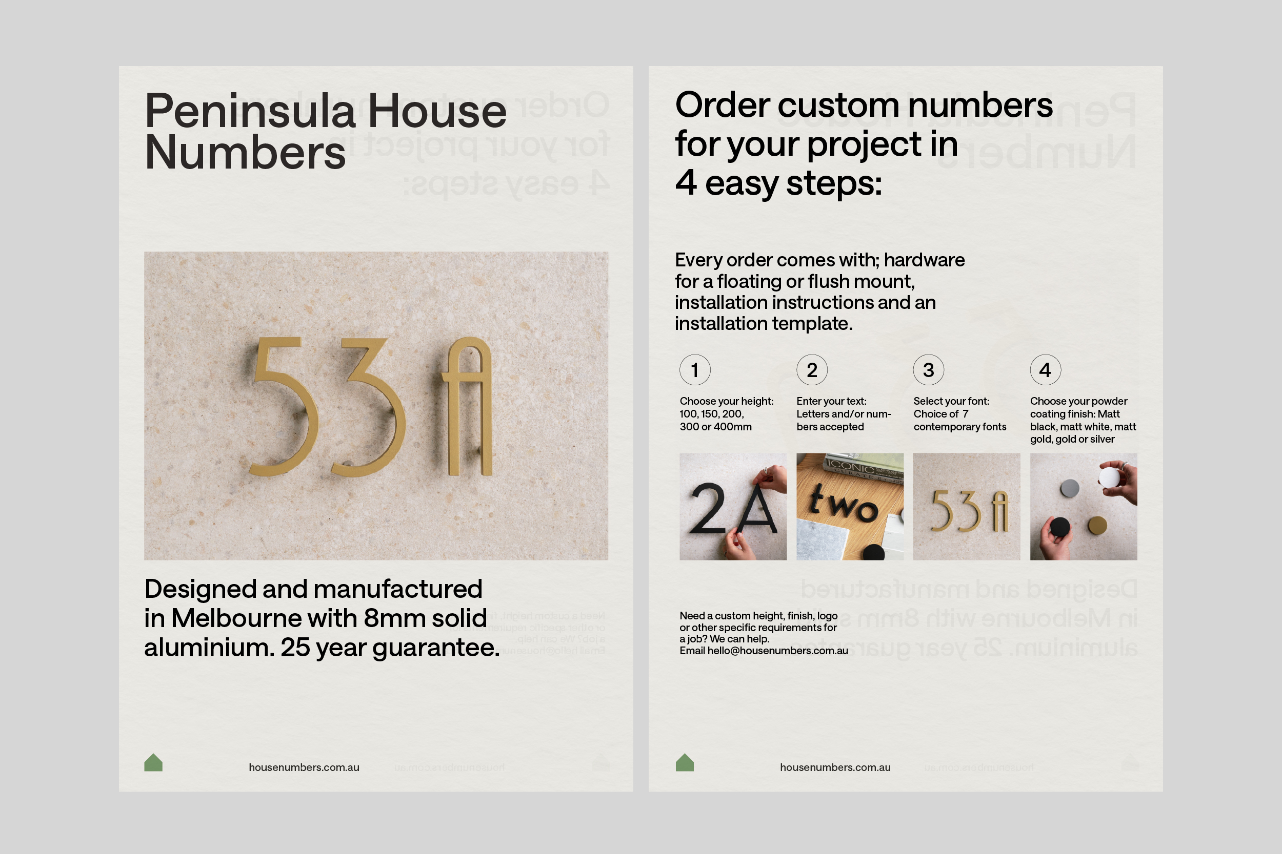 Peninsula House Numbers crafts custom house numbers for design-conscious, architectural clients who appreciate details. We worked with the team to develop a beautiful, timeless new identity that featured simplicity and elegance above all else.